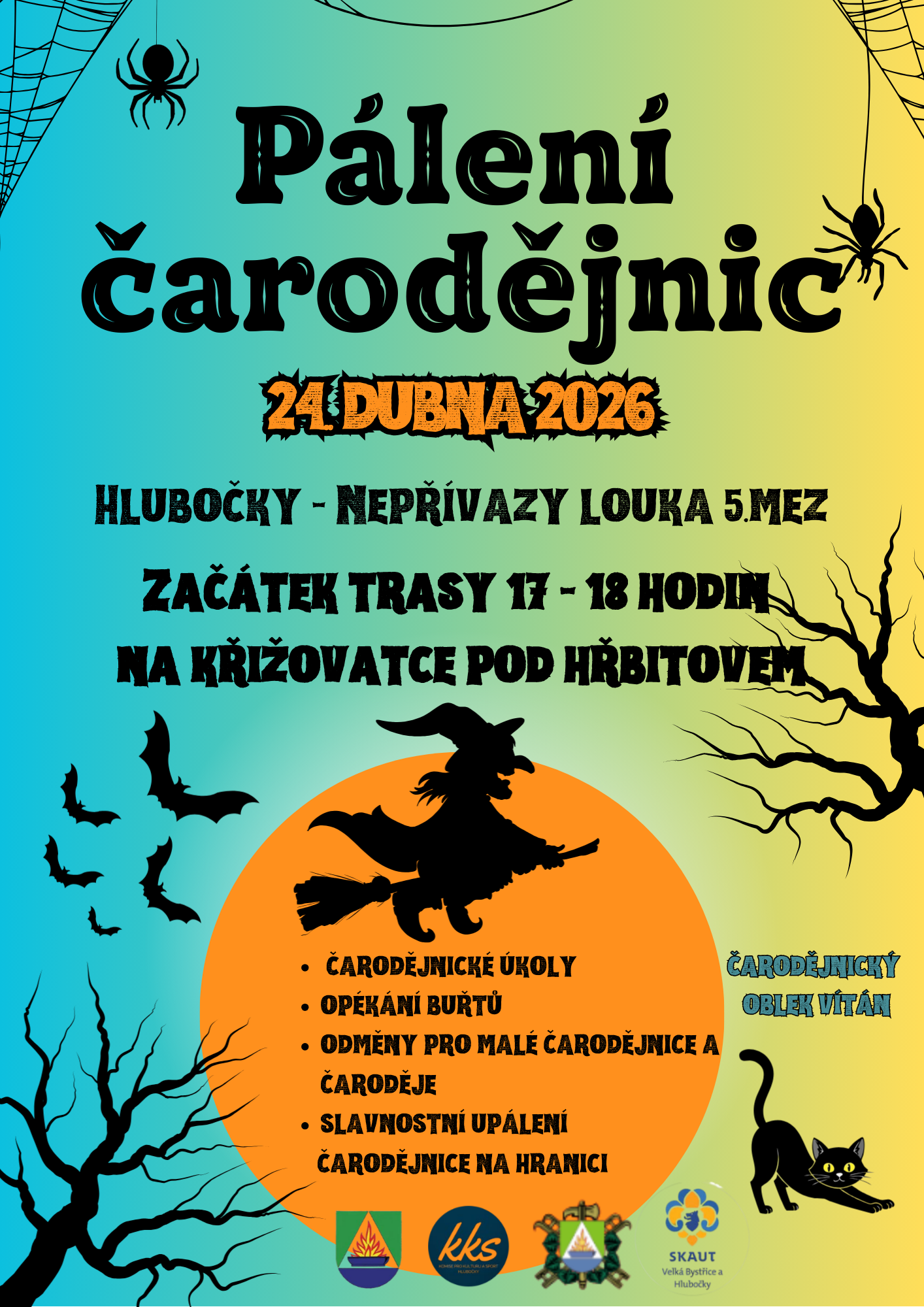 Obec Hlubočky ve spolupráci s Komisí pro kulturu a sport, SDH a Skauty zve všechny na Pálení čarodějnic. Čarodějnické úkoly, opékání buřtů a další. Čarodějnický oblek vítán.