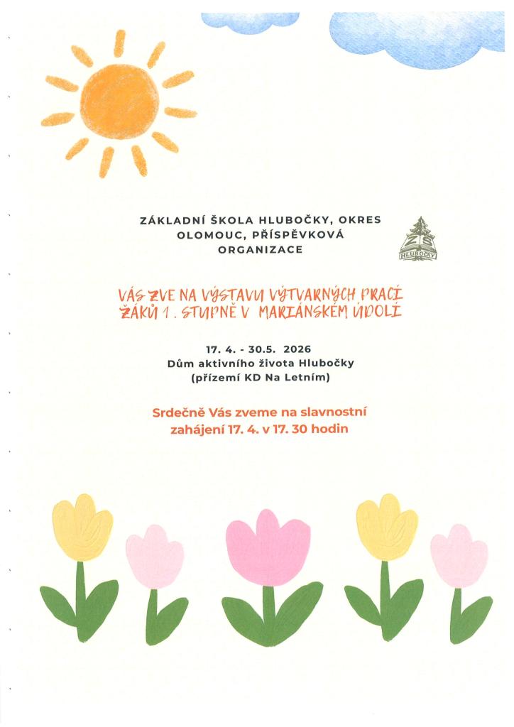 Základní škola Hlubočky zve všechny občany na výstavu výtvarných prací žáků 1. stupně v Mariánském Údolí. Slavnostní zahájení proběhne 17.4. od 17:30 v přízemí KD Na Letním Mar.Údolí.